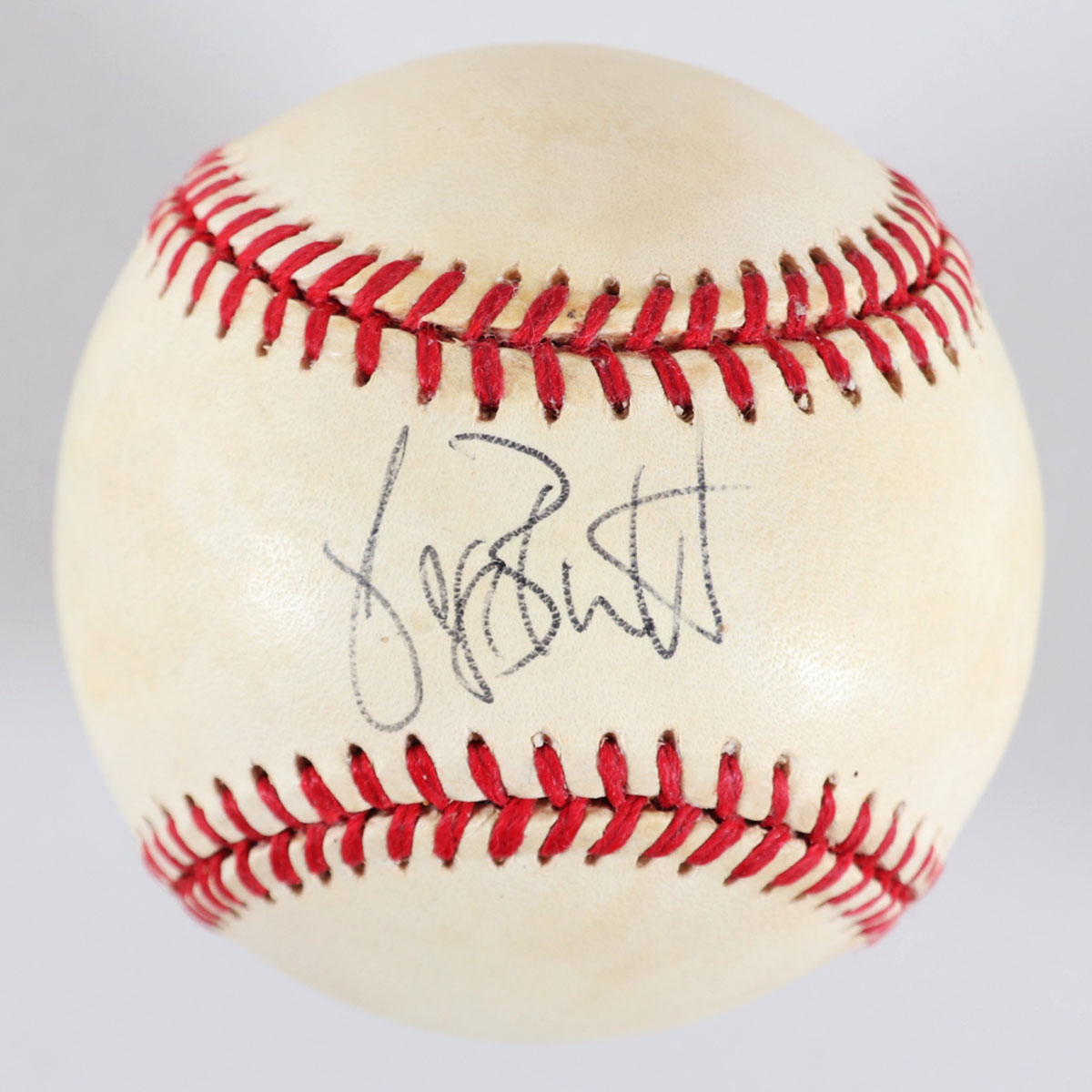 Presented is an OAL (Budig) baseball autographed by George Brett. He signed it on the sweet spot in blue ballpoint pen (“9”). The ball itself shows toning throughout from age.