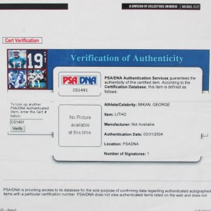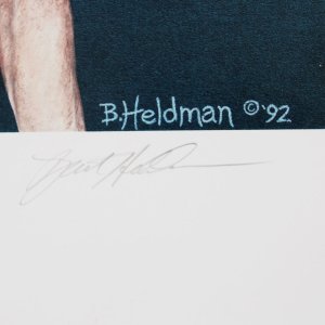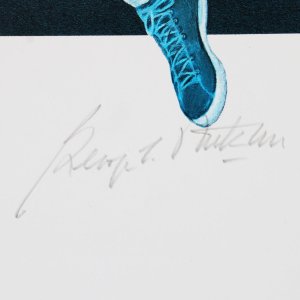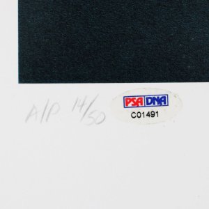 This offering features a George Mikan autographed in pencil 18×24 artist’s proof print, AP 14/50, created and signed in pencil in 1992 by Bart Heldman. The print is accompanied by a PSA/DNA authentication, ensuring the authenticity of both the signature and the artwork. As a notable piece for collectors, this print commemorates the legacy of one of basketball’s pioneering figures. Its limited availability enhances its value and appeal to the sport’s enthusiasts.