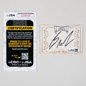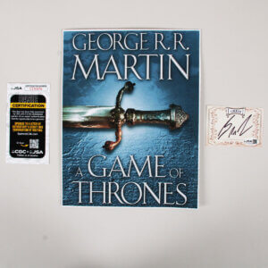 This exquisite piece features a signed cut from renowned author George R. R. Martin, measuring 2 1/2 x 3 1/2 inches. The signature, rendered in black felt tip, has been graded at an impressive 9, ensuring its quality and authenticity. Accompanied by a Certificate of Authenticity from JSA, this item is a remarkable addition for collectors and fans of the iconic Game of Thrones series. Its distinctive characteristics and provenance make it a valuable collectible, celebrating the legacy of a literary master.