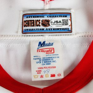 This remarkable piece of sports memorabilia features an authentic Detroit Red Wings NHL CCM Maska Ultrafil jersey in size 48, elegantly signed by the legendary Gordie Howe. The signature, executed in blue felt tip pen, adorns the front of the jersey, adding a personal touch to this exquisite item. Accompanied by a Certificate of Authenticity from JSA, this jersey not only represents a significant piece of hockey history but also serves as a prized collectible for enthusiasts and fans alike. Its impeccable condition and the illustrious connection to Howe elevate its value and appeal within the realm of sports memorabilia.