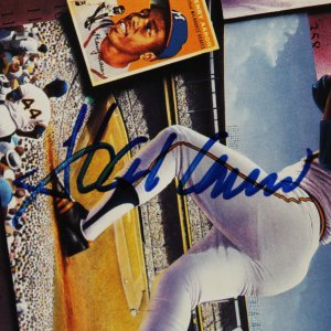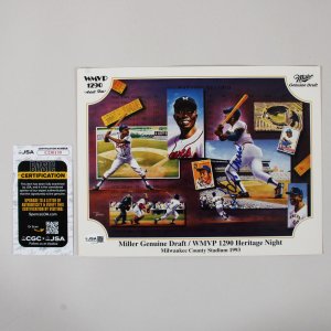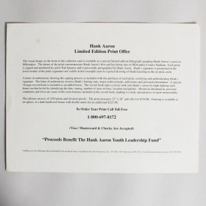 Offered here is a Hank Aaron signed photo card 8×10. The signature is in blue felt tip. Authentication: JSA Basic Cert & Sticker