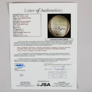 Presented is a ONL (Giles) baseball that was signed by Hall of Famers and stars. 19 Signers in blue/black ink with varying degrees of legibility include: Babe Herman, Ernie Lombardi, Ted Lyons, Dizzy Dean, Lefty Gomez, Bob Feller, Lefty O’Doul, Luke Appling, Lefty Gomez, Joe DiMaggio, Bill Dickey, Frank Frisch, Johnny Mize, Allie Reynolds, Joe Sewell and others. The baseball itself shows toning throughout.