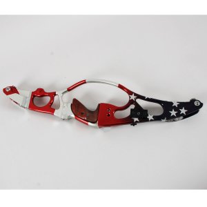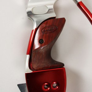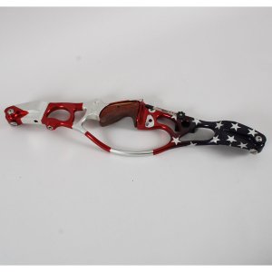 Offered for sale is a Hoyt recurve compound bow riser customized with a red, white, and blue American flag theme. It comes in the original box and is in mint, unused condition. Hoyt Archery is an American manufacturer known for its competition bows, which are frequently used in the Olympics. The image primarily shows the bow’s riser and a wooden grip.