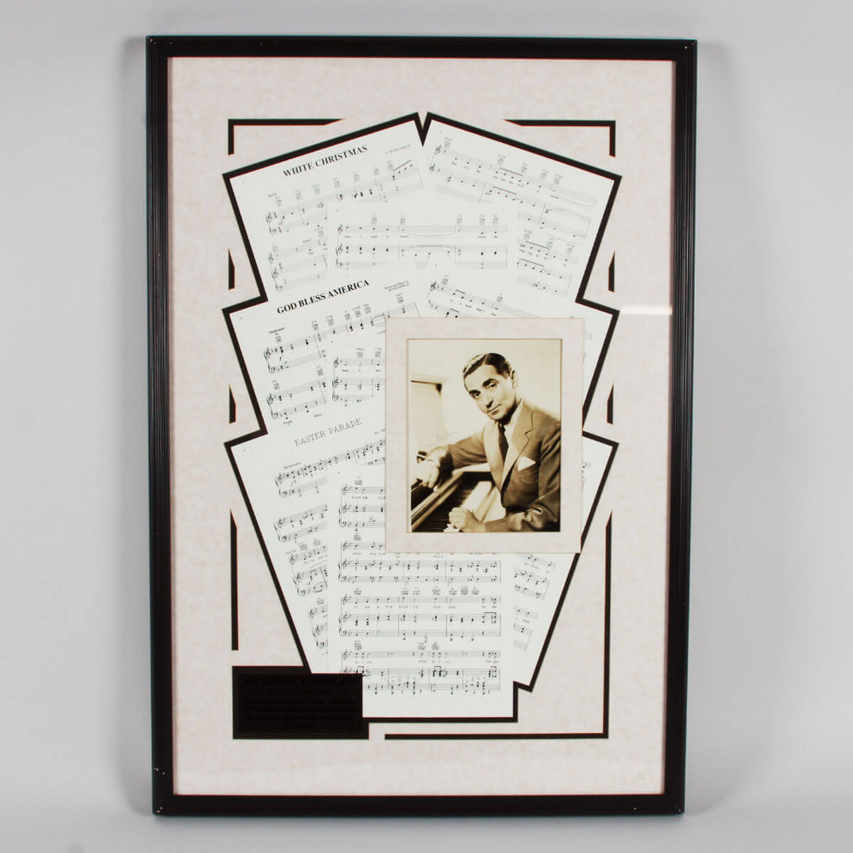 Presented is an 8×10 black and white photo featuring the autograph of composer/songwriter, Irving Berlin. He signed the photo in black ink (“7″). It was placed centrally in a display along with a plaque and his song sheets for display. The overall measurement of the display is 25.5″ x 36.5”.