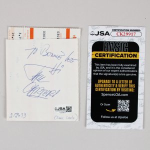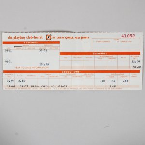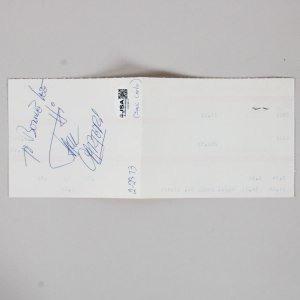 The Jack Carter signed pay stub from the Playboy Club Hotel is a remarkable collectible that showcases a piece of entertainment history. Accompanied by a Certificate of Authenticity from JSA, this item assures collectors of its legitimacy and significance. The signature, executed in blue ink, exhibits an impressive grade of 9, reflecting the quality and clarity of the inscription. Furthermore, the personalization adds a unique touch, enhancing its appeal to admirers of Jack Carter’s legacy. This pay stub serves not only as a financial document but also as a testament to the vibrant culture of the era, making it a valuable addition to any collection.