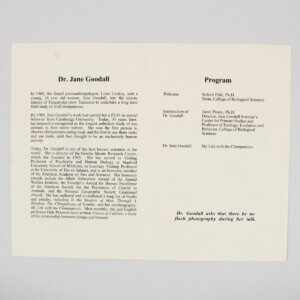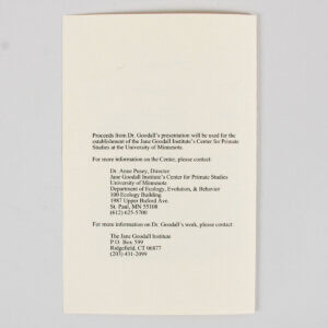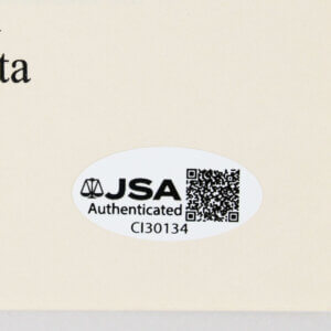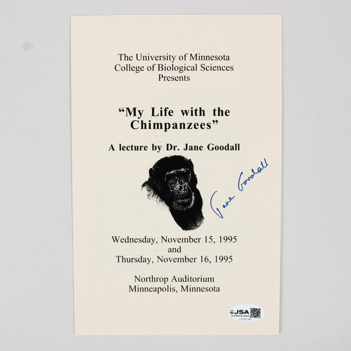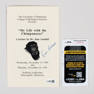 Offered here is a Jane Goodall signed program. The signature is in blue and grades a “9”. Authentication: JSA Basic Cert & Sticker