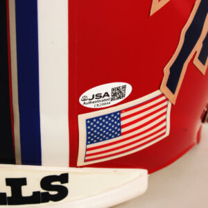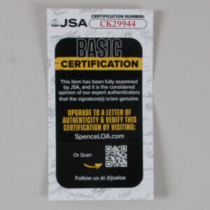 This exceptional item features a full-size helmet signed by the legendary Jim Kelly, a hallmark of his remarkable career in professional football. Accompanying the helmet is a Certificate of Authenticity (COA) from JSA, ensuring the signature’s legitimacy and providing peace of mind for collectors. The signature itself is rendered in black ink and is graded at a 9, indicating its pristine condition. This makes it not only a valuable addition for any sports memorabilia enthusiast but also a tribute to Kelly’s enduring legacy in the sport. The helmet stands as a testament to his extraordinary achievements on the field and is a must-have for serious collectors.