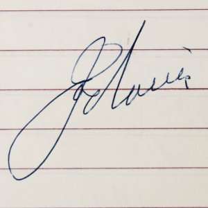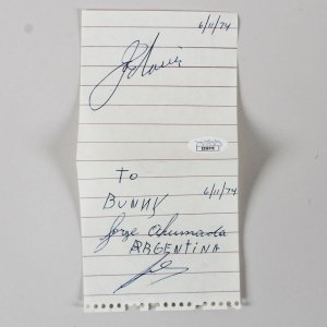 This rare piece of 4×4 lined paper features the autograph of the legendary heavyweight champion Joe Louis, dated June 11, 1974. Accompanying his signature is the presumed autograph of the Argentine boxer Jorge Victor Ahumada, known as Aconcagua, also dated to the same period on the other side. Both signatures attest to a significant moment in boxing history, showcasing the connection between these two notable figures in the sport. The Joe Louis autograph (only) is accompanied by a full letter certificate of authenticity from JSA, ensuring its provenance and value to collectors and enthusiasts alike.