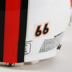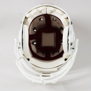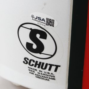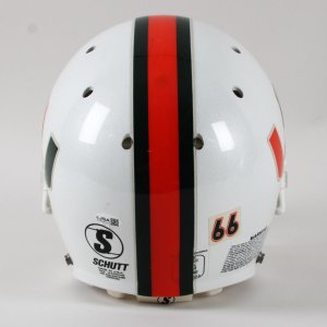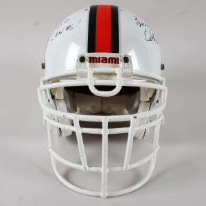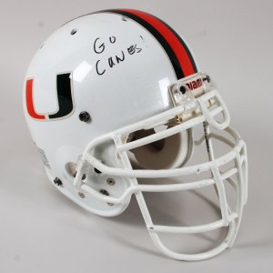 Presented here is a game issued Miami Hurricanes helmet that was autographed by Larry Coker in black felt tip. He added the inscription, “Go Canes” on the opposite side. The Schutt helmet features decals on the sides showcasing the classic U decal in orange/green. It features its original padding. The facemask is still intact and the central portion features the orange/green striping. The interior also has warning stickers inside. Overall, the rare helmet shows mild storage/age wear.