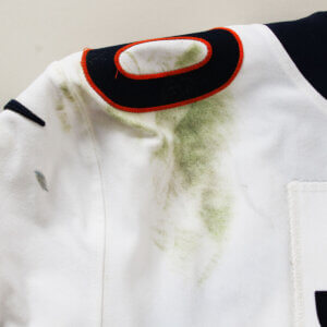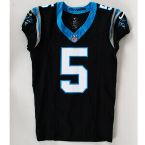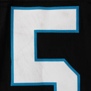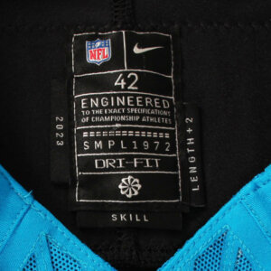 Presented is a Carolina Panthers jersey that was worn by Laviska Shenault, Jr. during the 2023 season. Provenance indicates that this was possibly worn pre-season or vs. Seattle Seahawks. It’s a black Nike jersey with Panthers with logos on the sleeves. The tail and sleeve ends are elasticized. The back shows tremendous wear/soiling from play. Inside the collar is a tag with [size] ‘42’ and LENGTH +2 flap tag attached. NFL shield on the front collar. Player number (5) is done on the front/back in teal/white tackle twill and both shoulders. Player name (SHENAULT, JR.) on a nameplate across the back.
