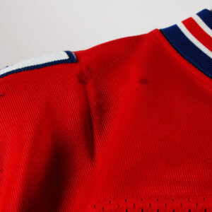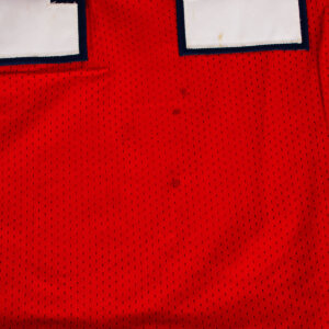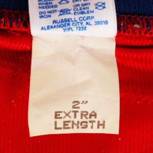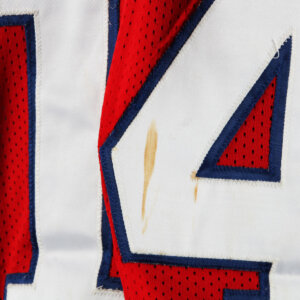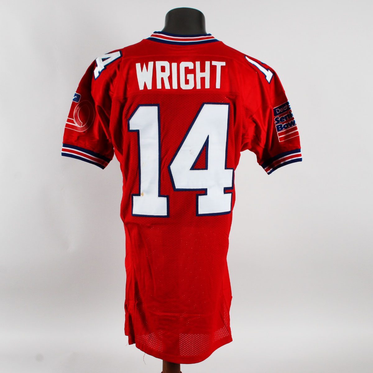 Presented is a University of Florida Player Lawrence Wright game worn Senior Bowl football jersey. This jersey has a collar tag was produced by Russell Athletic and is a [size] 48 with 2″ extra length. It also has Senior Bowl screened across the front.. His number “14” is on the front/back in white/blue (sewn on). His name “WRIGHT” also screened on is showcased across the back nameplate in white. The right/left sleeve have the Senior Bowl logo screened on. Sponsored by Delchamps (1996–2001). Wright was part of the 1996 National Championship team. The jersey shows mild-to-moderate wear throughout with stains etc.