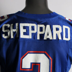 The Gator patch logo is present on the chest. The sides are Spandex and the custom elastic sleeves are striped in team colors orange and white. Across the back is his name “SHEPPARD” in white on a nameplate. The collar tagging shows it is a Nike [size] 44.  The SEC patch is set in the center collar portion.  It shows great wear/use overall with hit marks and crackling on the name on the nameplate. Overall, a great Gators game worn jersey.