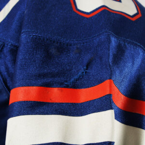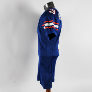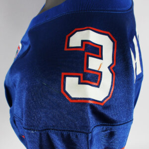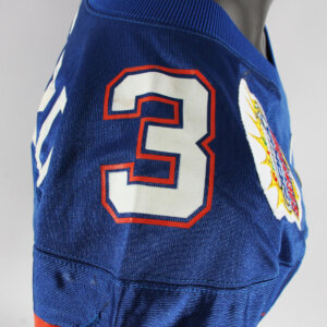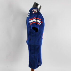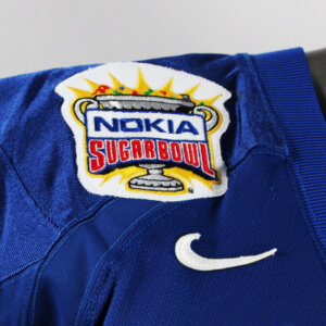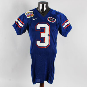 This was worn during the Sugar Bowl. On the front, back, and each shoulder is the player number “3” screened on in white and orange. The Gator patch logo is present on the chest along with the Nokia Sugar Bowl, sides are Spandex and the custom elastic sleeves are striped in team colors orange and white.