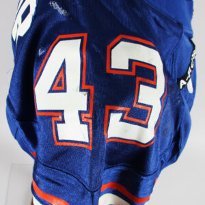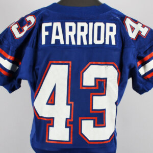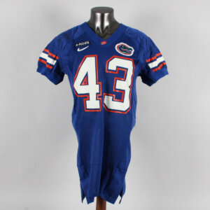 Presented is a blue University of Florida jersey that was game worn by former Gators player, Matt Farrior a linebacker during his college career. He played in 39 games, with 15 starts for 1,232 plays…Also played in the 2001 Sugar Bowl and 2002 Orange Bowl…117 total tackles (57 solo) and seven “Big Plays” (three TBLs, two forced fumbles and two INTs).