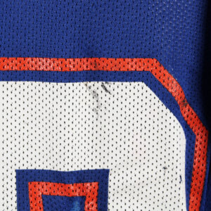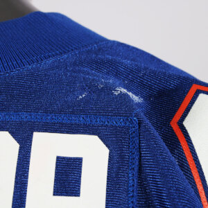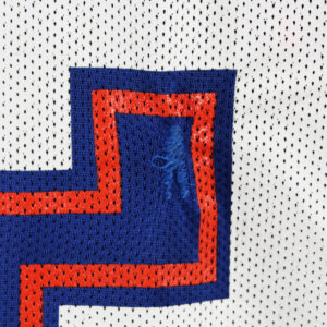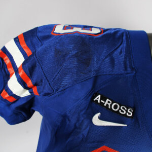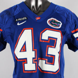 On the front, back, and each shoulder is the player number “43” screened on in white and orange. The Gator patch logo is present on the chest along with the special A-Ross patch for Eraste Autin, sides are Spandex and the custom elastic sleeves are striped in team colors orange and white. Across the back is his name “FARRIOR” in white on a nameplate. The collar tagging shows it is a Nike [size] 46 with special notes by equipment manager. It is custom hemmed at the bottom for Farrior. The SEC patch is set in the center collar portion.  It shows tremendous wear/use overall with hit marks etc.. Overall, a great Gators game worn jersey.