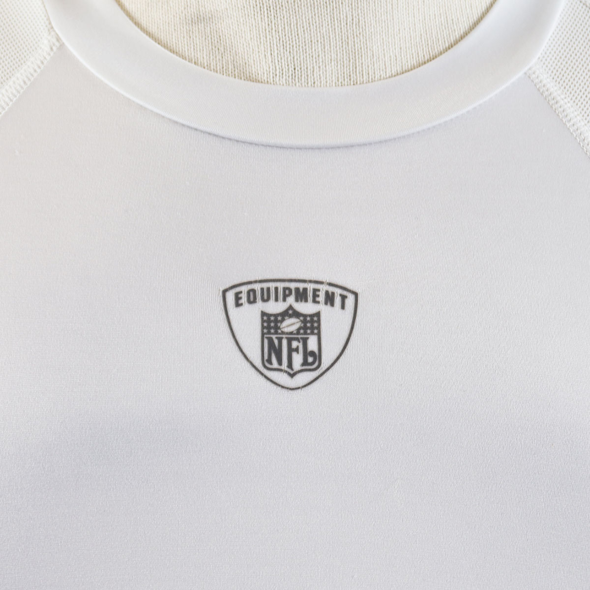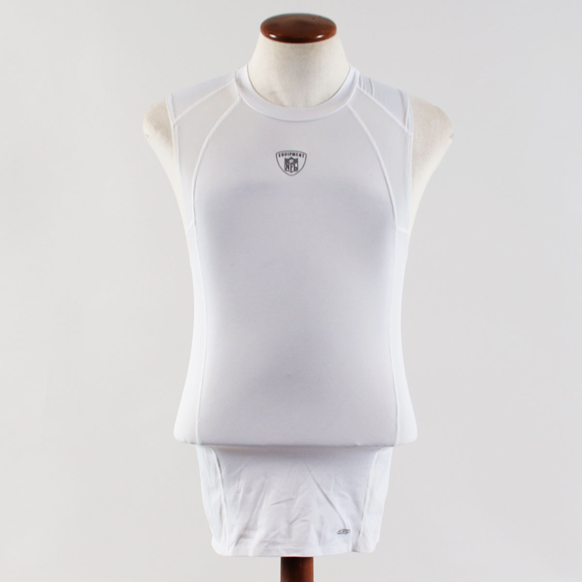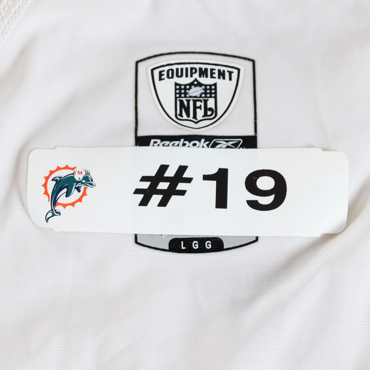 Sometimes you feel like you have a target on your back. Well, in this case you do. Presented is a Miami Dolphins white practice worn shirt. It features that target on the verso – NFL Equipment shield on the front. Collar has printed tag with [size] Large and player identifier which in this case was #19 (unattributed). Shows wear and is tank style – Play Dry material.