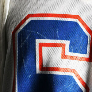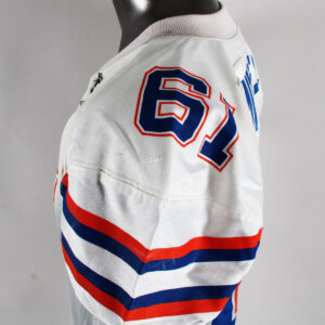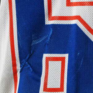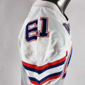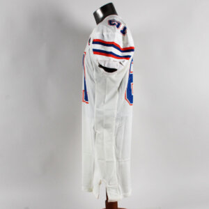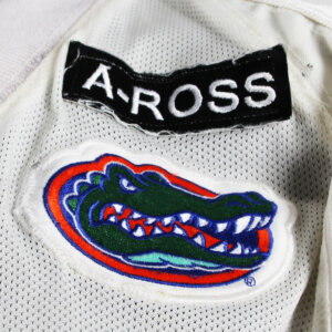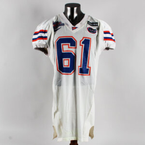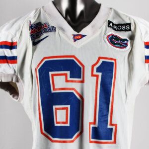 Presented is a white jersey that was game worn by University of Florida Gators player, Mo Mitchell during the 2004 season and the Peach Bowl. On the front, back, and each shoulder is the player number “61” screened on in blue and orange. The Gator patch logo is present on the chest, sides are Spandex and the custom elastic sleeves are striped in team colors orange and white. Across the back is his name “MITCHELL” in blue on a nameplate. The collar tagging shows it is a NIKE [size] 50 with 01 handwritten in black felt tip. An A. Ross memorial patch adorns one of the sleeves. This one also features a 2004 Chick-fil-a Peach Powl patch sewn on. The SEC patch is set in the center collar portion. Overall, the jersey shows great wear with soiling/marks throughout from the field. Overall, a great Gators game jersey from the Peach Bowl.