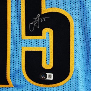 This authentic navy blue pro-style jersey, signed by Nikola Jokic, is a remarkable collectible for basketball enthusiasts. Accompanied by a Beckett sticker, this item ensures its legitimacy and value. The jersey showcases Jokic’s branding and represents his significant contributions to the sport. An excellent addition to any memorabilia collection, it celebrates the achievements of one of the game’s greats.