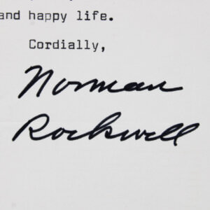 Offered here is a Norman Rockwell signed typed letter. Size 6×8. Signature is in black felt tip and grades “10”. Authentication: JSA Full Letter