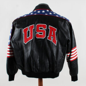 The 2002 Official Olympics leather jacket in size XL is a stylish, timeless piece, perfect for any fan of the Salt Lake 2002 Games. Made with high-quality materials, this black jacket features the iconic USA team logo, making it a great way to show your support for your favorite team. Suitable for both men and women, this unisex adult jacket is a must-have for any Olympics enthusiast looking to commemorate this historic event. Has 2 side pockets, an inside pocket, a zipper, and 2 snap buttons at the bottom.