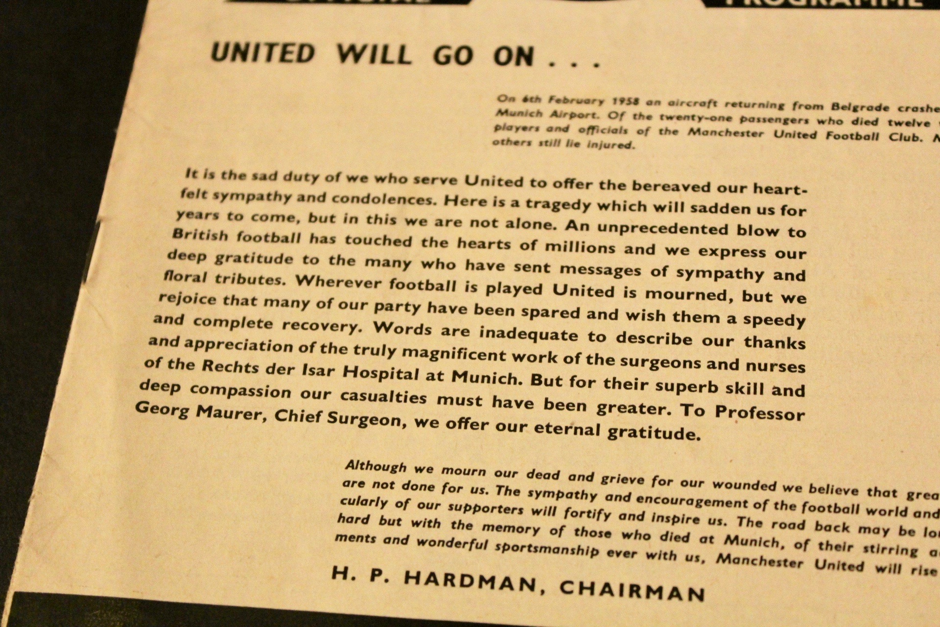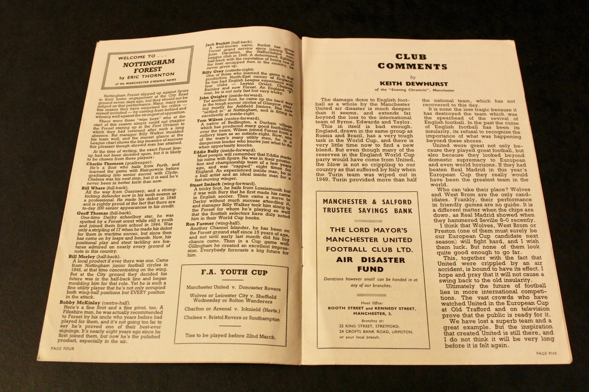 The match at Old Trafford against Nottingham Forest was United’s first League match following the tragedy. This is an original programme from that match.