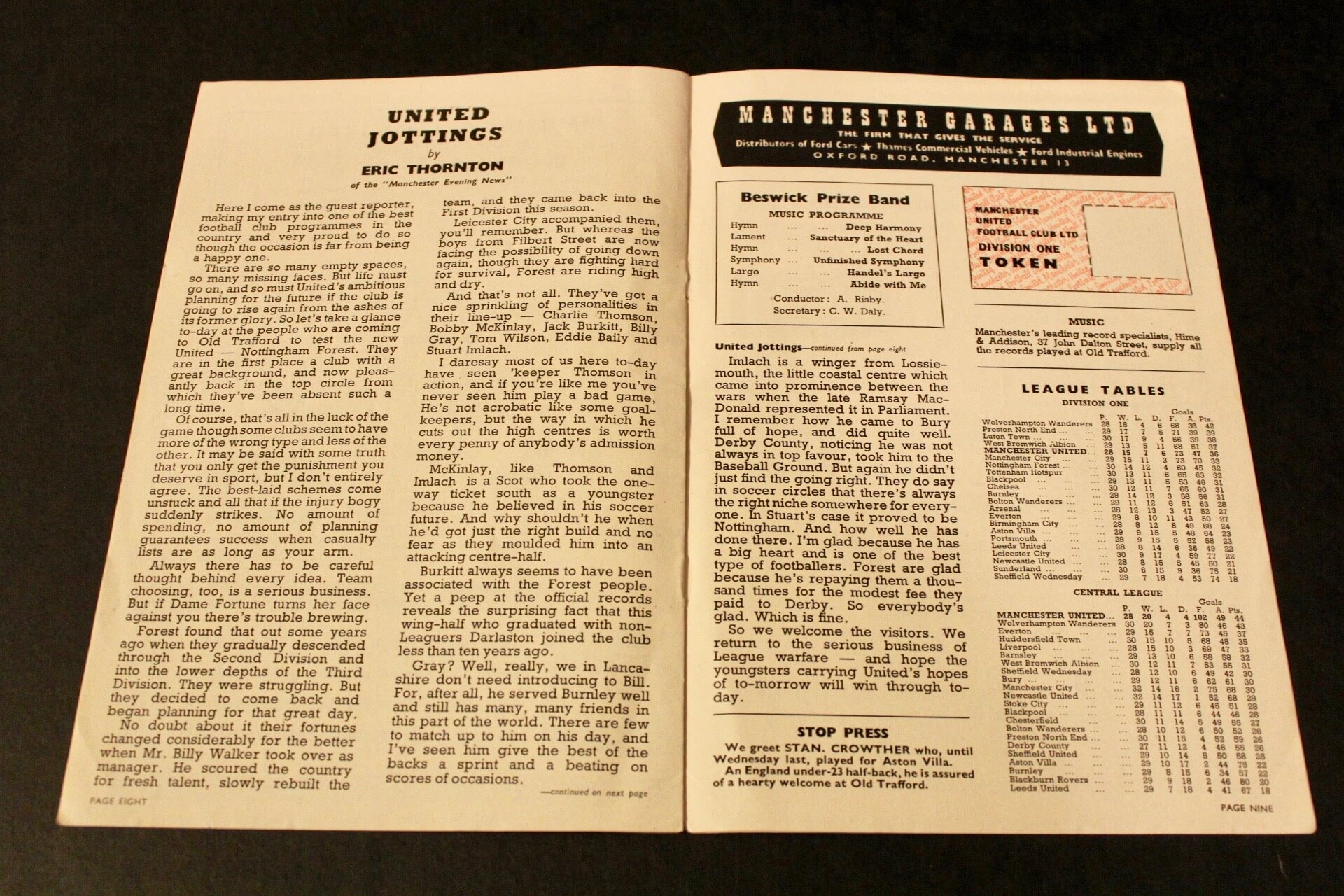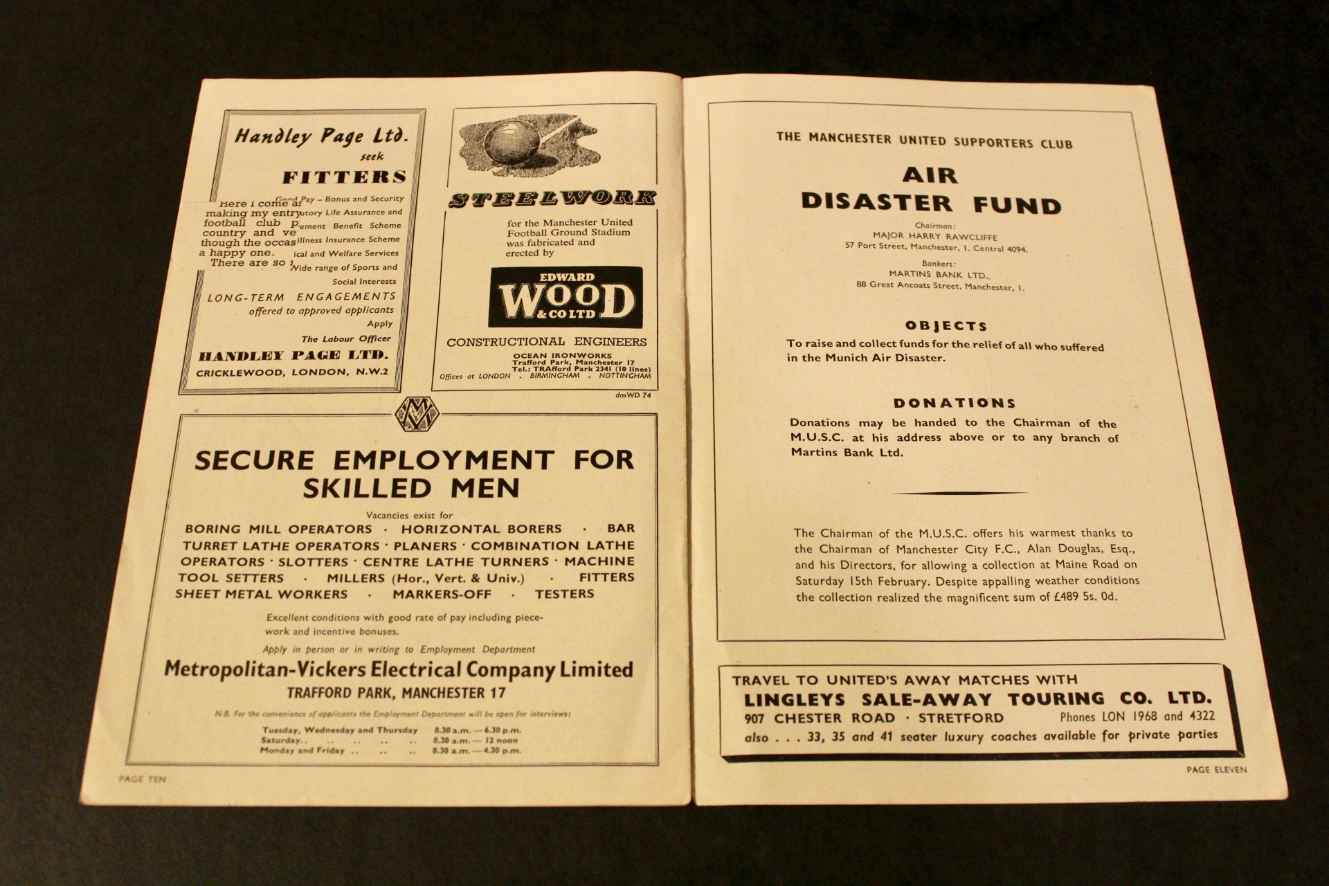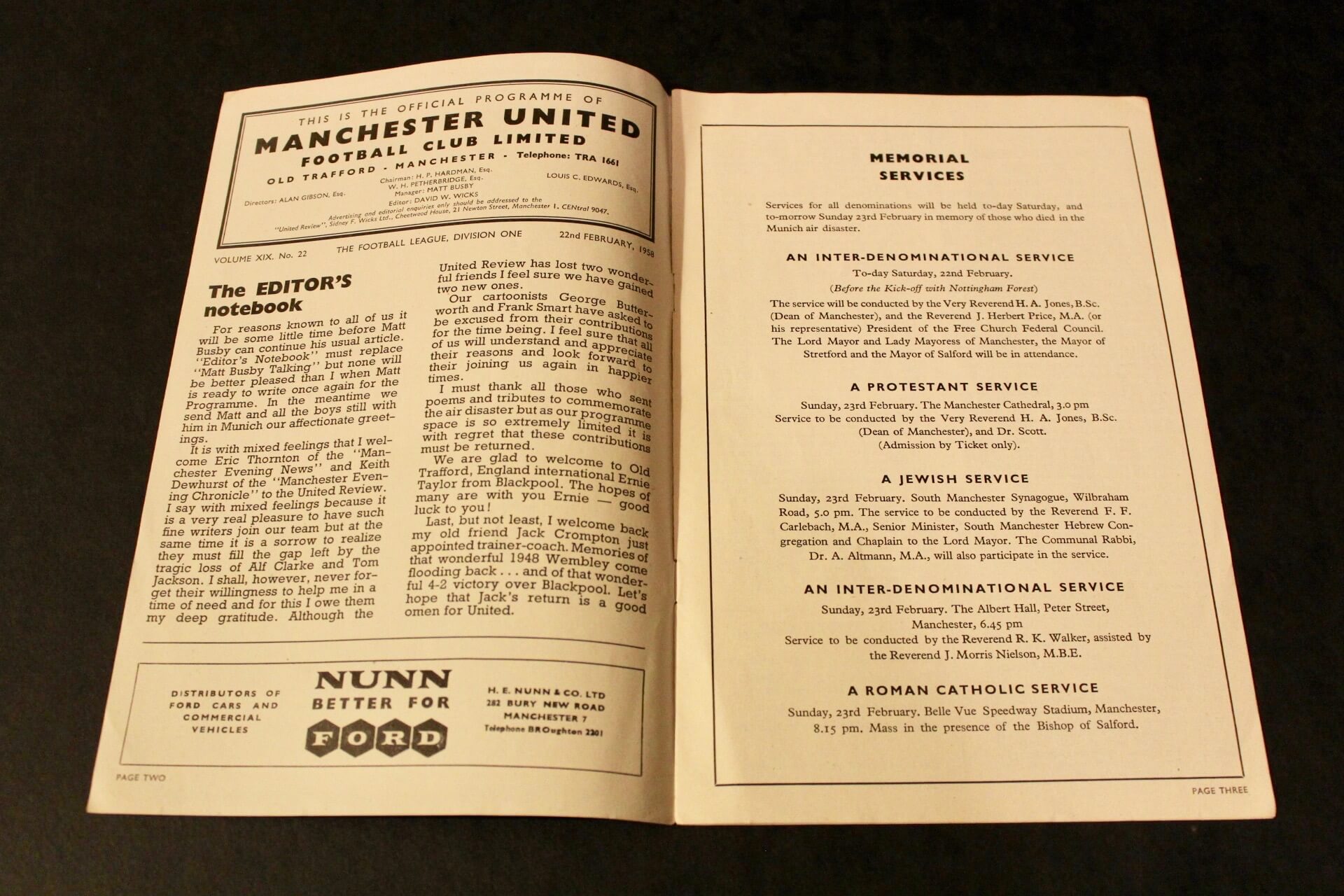 An original Manchester United Programme dating to the 1957/58 season. This programme relates to the February 22, 1958 First Division Match between Manchester United and Nottingham Forest at Old Trafford. This was the first League match for United following the Munich Air Disaster. The Munich Air Disaster occurred on February 6, 1958 when British European Airways Flight 609 crashed on its third attempt to take off from a slush-covered runway at Munich-Riem Airport, West Germany. On the plane was the Manchester United football team, nicknamed the “Busby Babes”, along with supporters and journalists. Twenty of the 44 on the aircraft died at the scene. The injured, some unconcious, were taken to the Rechts de Isar Hospital in Munich where three more died, resulting in 23 fatalities with 21 survivors. The team was returning from a European Cup match in Belgrade, Yugoslavia having eliminated Red Star Belgrade to advance to the semi-finals of the competition.