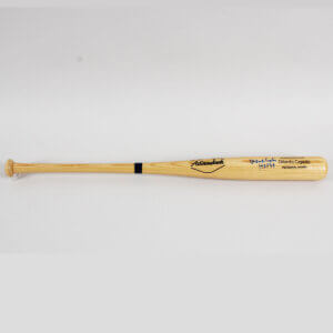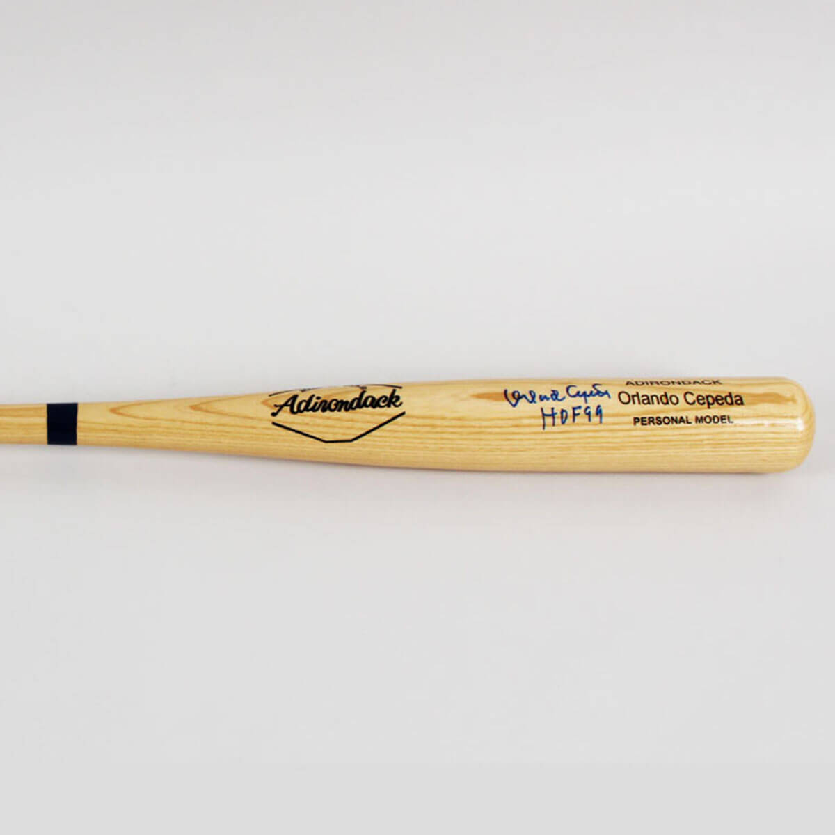 Offered here is a Orlando Cepeda signed and inscribed player model baseball bat. The signature is in blue felt tip and grades “10”. The inscription reads “HOF 99”. Authentication: JSA Basic Cert & Sticker