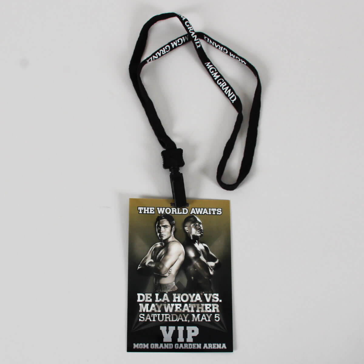 Presented for sale is an Oscar De La Hoya vs. Floyd Mayweather VIP Pass from May 5, 2007, complete with a lanyard attached. The pass itself is in NR/Mt condition.