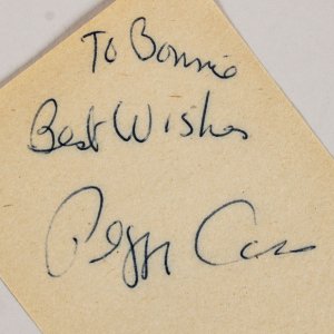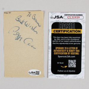 This item features an authentic signature of Peggy Cass, personalized in blue ink “To Bonnie, Best Wishes”, elegantly rendered on a 3×5 paper cut from 1975. Accompanied by a Certificate of Authenticity from JSA, it assures the provenance and legitimacy of the signature. This collectible is a valuable addition for any enthusiast of notable personalities or memorabilia from that era.