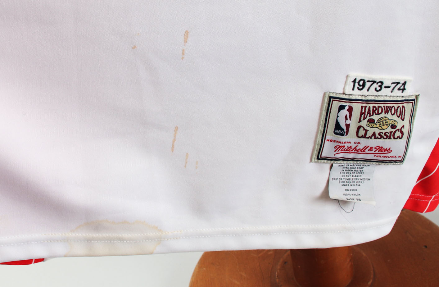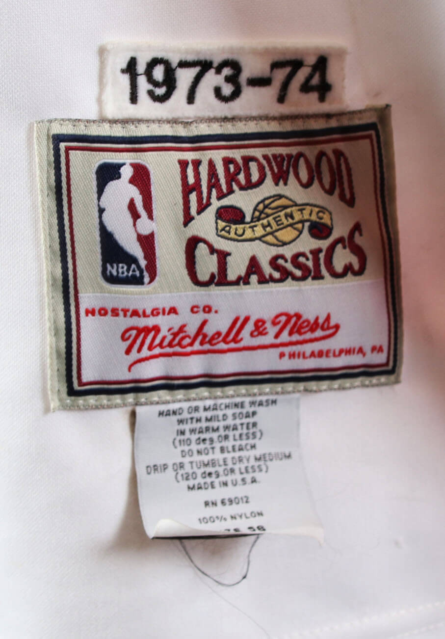 Presented is a Pete Maravich Atlanta Hawks Mitchell & Ness authentic jersey [size] 56. White jersey with “HAWKS” script on the front and “PISTOL – 44” on the back. The Hardwood Classics tagging is present on the front tail and the style is from 1973-74. Note, the jersey has some staining present on the front near the bottom tail tagging.