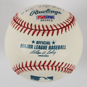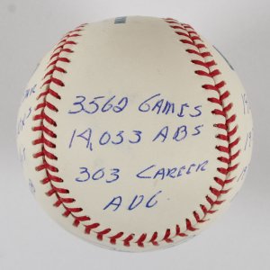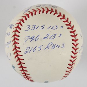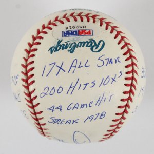 Original Reggie Jackson.com Pete Rose Stat baseball. Signed in blue ink throughout, this clean white baseball grades 9/10. Limited Edition for the history of the All-time Hit King. This is the baseball to have in your stat collection. COA PSA #52916