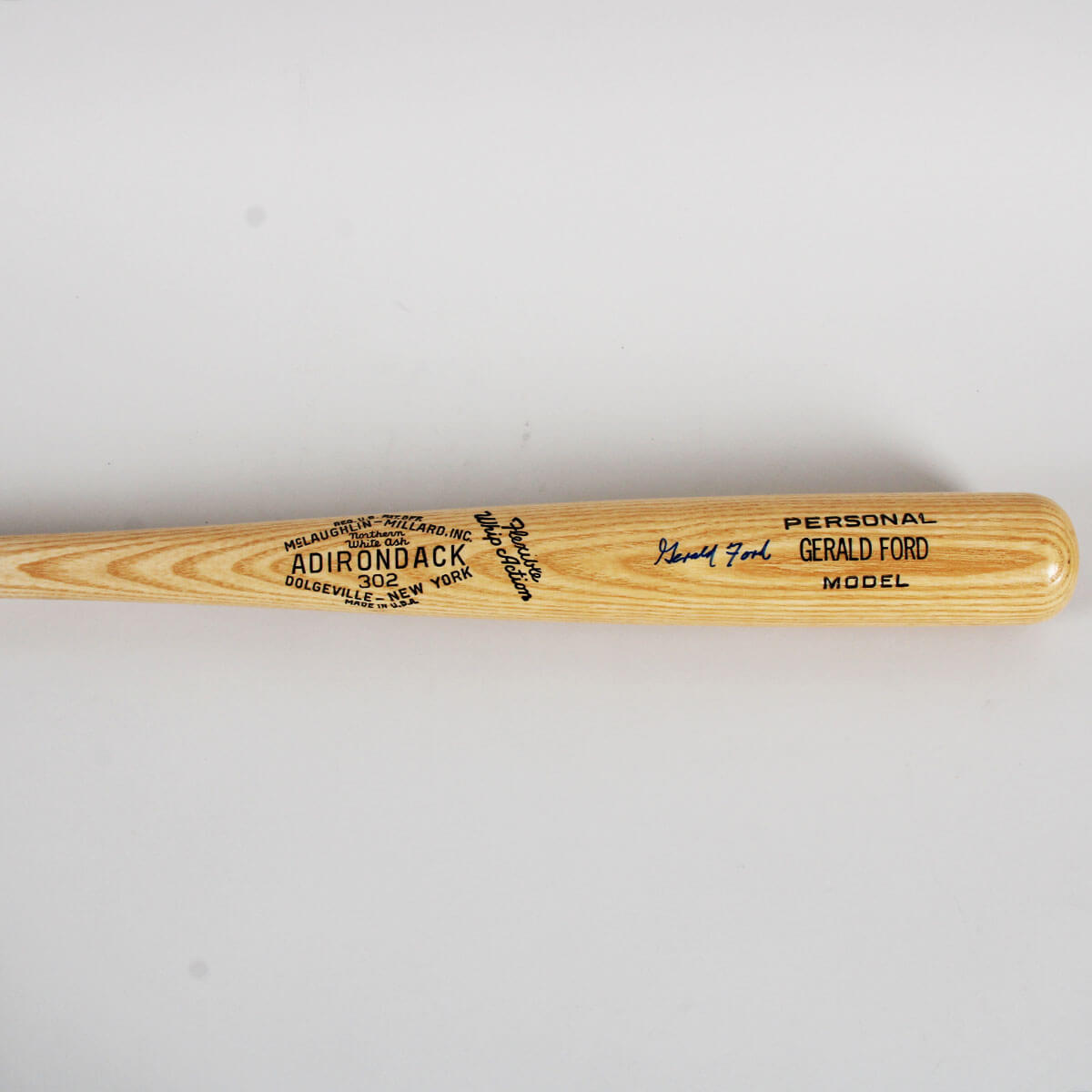 Presented is a custom personal model Adironack bat signed by former President Gerald Ford. The blue felt tip signature (“9”) displays well on the barrel.