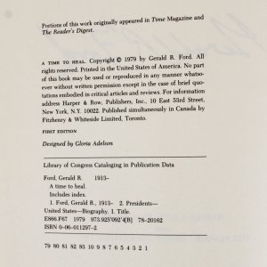 Presented is the hardcover book – “A Time to Heal” signed by President Gerald Ford. He signed it on an end page in black felt tip pen (“9”). This is a first edition book.