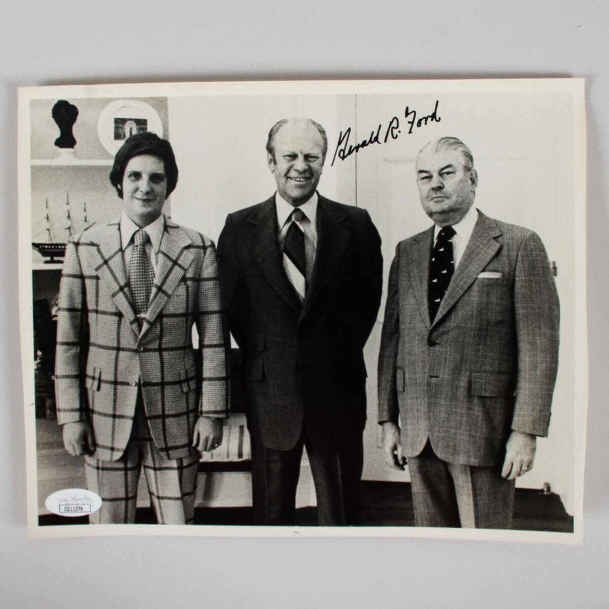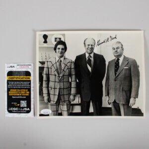 Presented is an 8×10 color photo of President Gerald Ford with others. The former President signed it in black felt pen “9-10”.