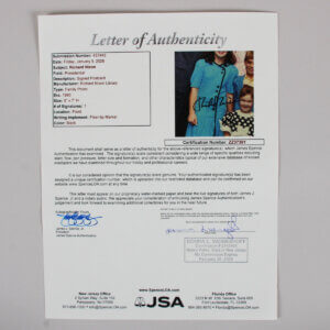 Offered here is a President Richard Nixon signed postcard 5×7. Family photo of 50th wedding anniversary. The signature in black and grades “9”. Authentication: JSA Full Letter