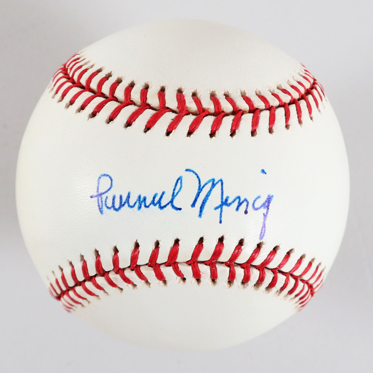 Presented is an OAL (Budig) baseball autographed by Purnell Mincy. He signed it on the sweet spot in blue ballpoint pen (“9”). The ball itself shows toning from age.