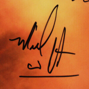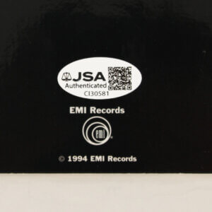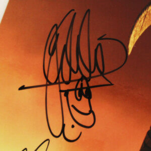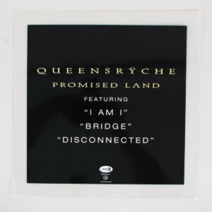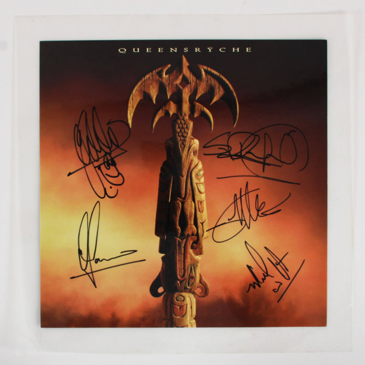 This album slick 12×12 (laminated) was autographed by (5) members of the band Queensrÿche. The promotional slicks themselves were made for promotion of the band’s album and subsequently many were destroyed in the process after events were over. This one was autographed at one of the promotional events in black felt tip (“9-10”) by Michael Wilton and Chris DeGarmo, drummer Scott Rockenfield, bassist Eddie Jackson, and lead vocalist Geoff Tate.