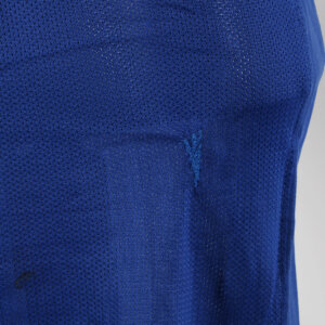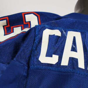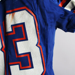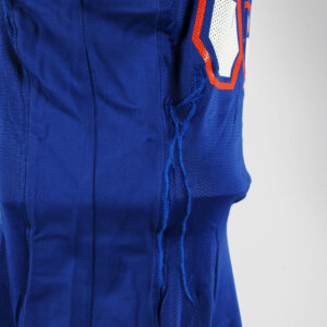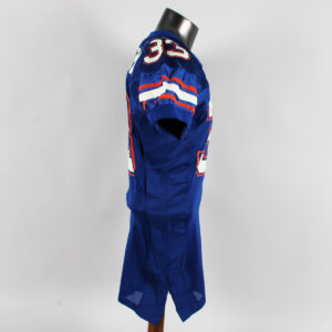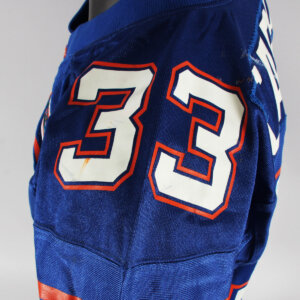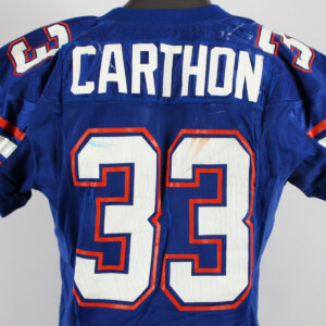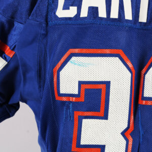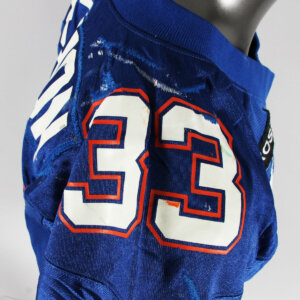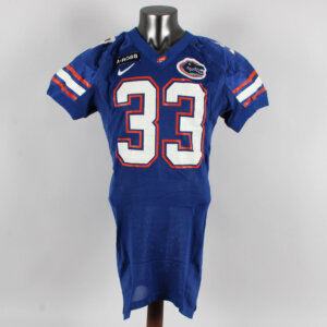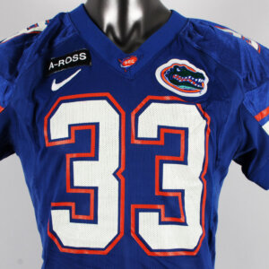 Presented is a blue University of Florida jersey that was worn by former Gators player, Ran Carthon a running back during his college career. On the front, back, and each shoulder is the player number “33” screened on in white and orange. The Gator patch logo is present on the chest along with the A-ROSS patch, sides are Spandex and the custom elastic sleeves are striped in team colors orange and white. Across the back is his name “CARTHON” in white on a nameplate. The collar tagging shows it is a Nike [size] 44 with handwritten inventory notes. It is custom hemmed at the bottom. The SEC patch is set in the center collar portion.  It shows tremendous wear/use with hit marks, scrapes, paint remnants, repairs etc. Overall, a great Gators game worn jersey.