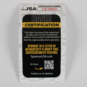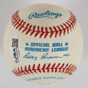 Reggie Jackson, an iconic figure in New York Yankees history, has left a lasting legacy in the world of baseball. This signed baseball, a Bobby Brown American League ball, stands as a testament to his remarkable career. The signature, penned in blue ballpoint ink, boasts an impressive grade of 9, reflecting its exceptional quality and preservation. Accompanied by a certificate of authenticity from JSA, this piece is a valuable addition for collectors and Yankees enthusiasts alike. The rich history associated with Reggie Jackson and the New York Yankees makes this signed baseball not only a cherished item but also a significant investment in the heritage of the sport.
