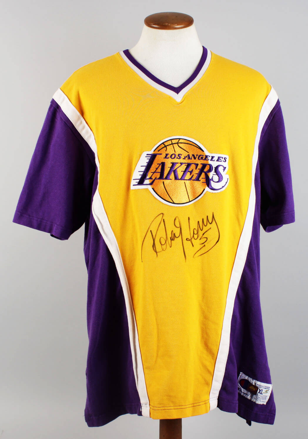 Robert Horry known as Mr. Clutch for the Los Angeles Lakers after hitting numerous big shots including the Game 7 three point buzzer beater that sent the Lakers to the 2000 NBA Finals and eventually their first title of the Shaq/Kobe Era. This is your chance to own a piece of Lakers memorabilia the Champion tagging and the size XL match specifically with what Horry wore in the 96-97 season. Also attached to the Shooting Shirt is the Lakers Auction House Hologram which was used for items purchased at the Lakers in Game auctions back in the Great Western Forum days. The Shirt shows tremendous wear and Horry penned his signature right across the front (8-9). Extremely Rare piece of 90’s Lakers memorabilia up for grabs.