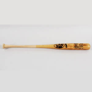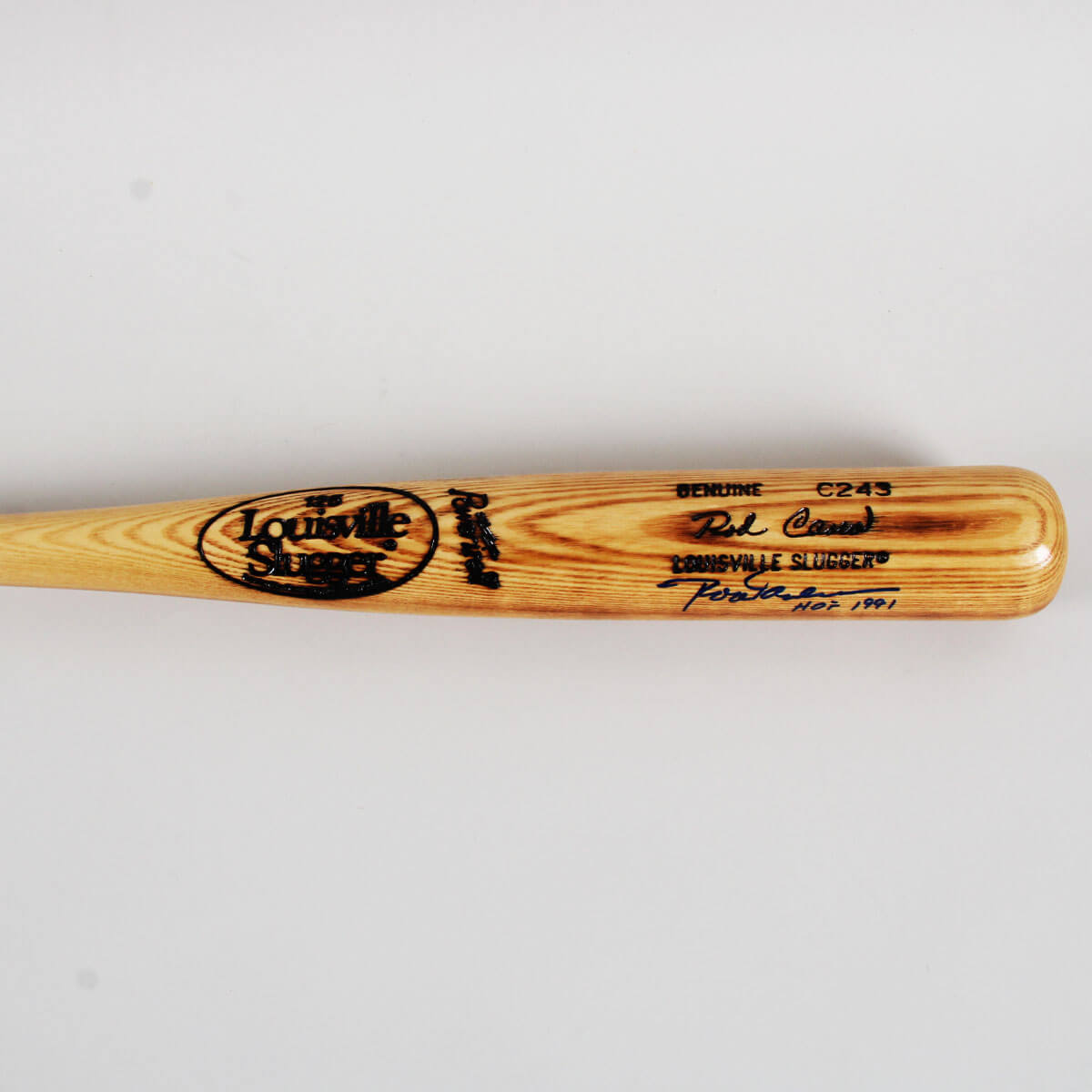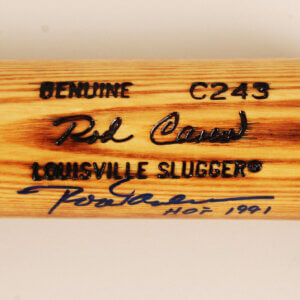 Offered here is a Rod Carew signed and inscribed player model baseball bat. The signature is in blue felt tip and grades “10”. The inscription reads “HOF 1991”. Authentication: JSA Basic Cert & Sticker