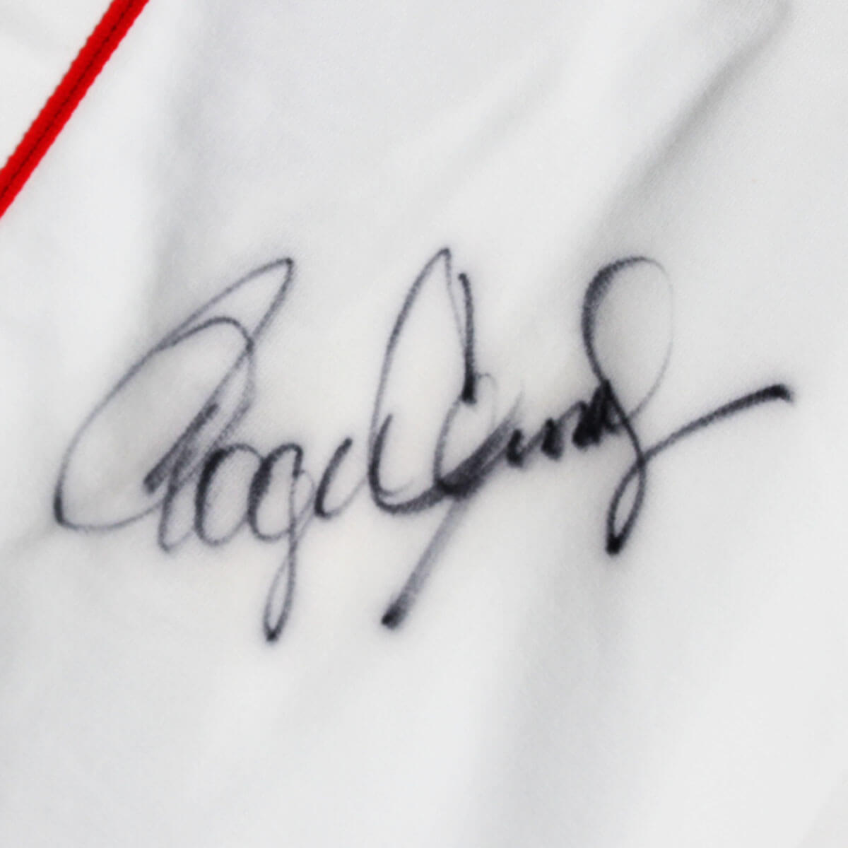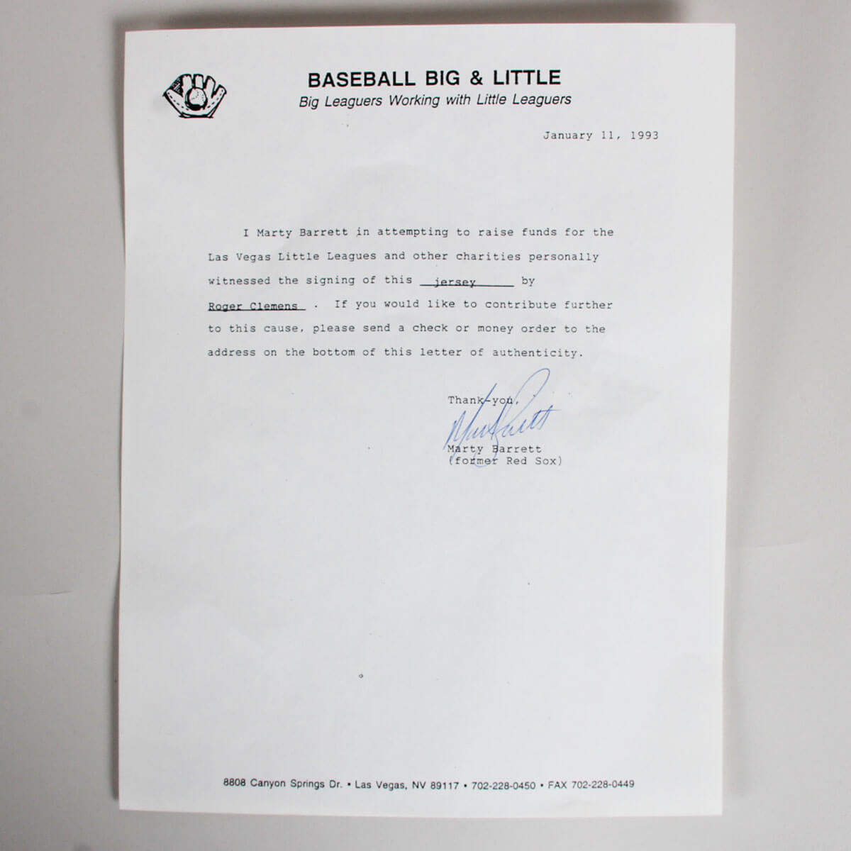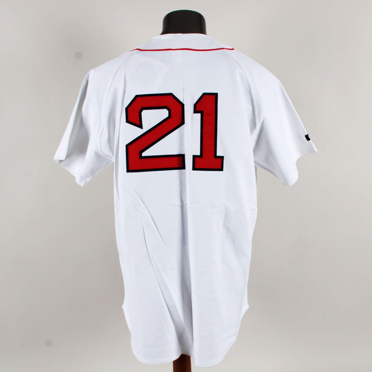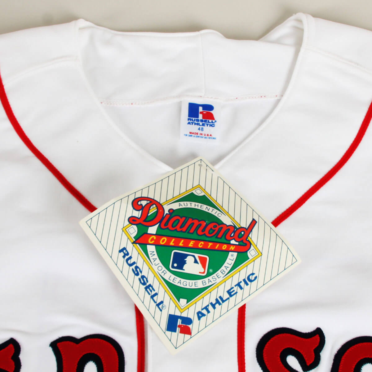 Presented is a Boston Red Sox jersey that was autographed by Roger Clemens. He signed the front in black felt tip (“8”). #21 jersey is Russell Athletic and is a [size] 48 NWT.