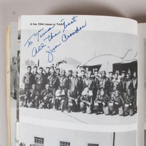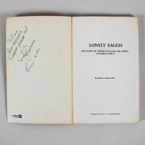 This exceptional softcover edition of The Lonely Eagles is adorned with the signatures of three distinguished Tuskegee Airmen: Rusty Burns, Andrew Wallace on an end page, and Jim Crowder inside. Each signature is a testament to their remarkable contributions to aviation and military history. Accompanied by a Certificate of Authenticity from JSA, this signed book is a valuable addition for collectors and enthusiasts alike. It not only commemorates their legacy but also serves as a poignant reminder of the courage and dedication exhibited by these pioneering aviators.