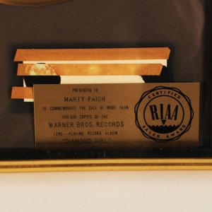 Seals & Crofts Gold RIAA Sales Award 1973 33 rpm record “Diamond Girl”. The award was presented to Marty Paich to commemorate the sale of more than 500,000 Copies of “Diamond Star.” It measures 16 1/2″ x 20 1/2″. All frames are sold as is, without warranty regarding the display’s condition. Note: One of the plagues in the frame needs to be reassembled. Please view the pictures provided.