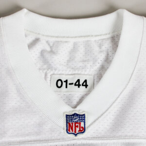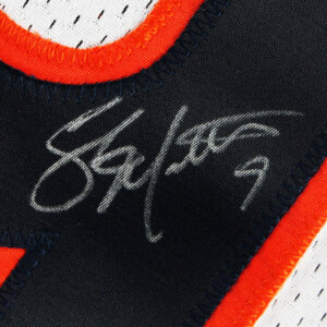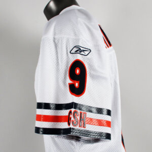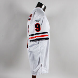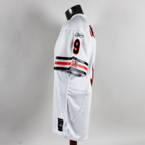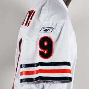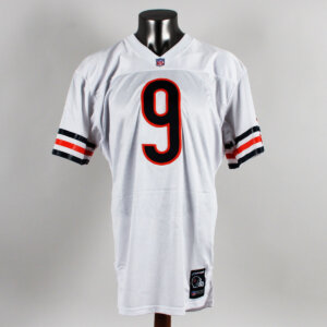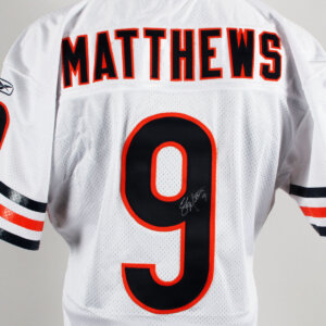 Presented is a Chicago Bears jersey that was issued to Shane Matthews during his career. On the left front tail is the “REEBOK” manufacturer’s tag with wash instructions. Attached is the size “44” flag tag. On the front, back, and both sleeves is the player number “9” in navy on orange vinyl lettering. Across the back is the player name “MATTHEWS” in navy on orange vinyl lettering on a name plate. On the left sleeve are the initials “GSH” in navy on orange vinyl lettering. It features spandex sides with custom elastic sleeves. The jersey shows no wear making it issued. As an additional attribute, Matthews signed the back number of the jersey in silver felt tip “9”. Overall, a nice Chicago Bears game issued jersey.