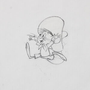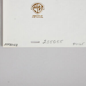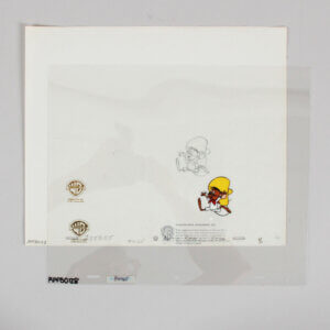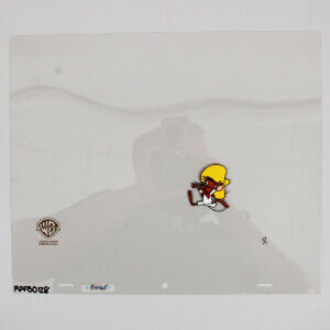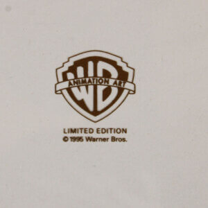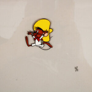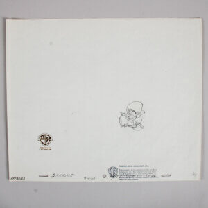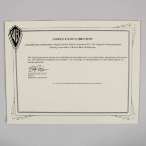This amazing Speedy Gonzalez original color production cell from Warner Bros. dates back to 1995 and measures 10 x 12 inches. This original production drawing was hand-inked onto the cell and expertly hand-painted on the reverse side. The certificate accompanies piece numbered 1/1. Accompanied by a Certificate of Authenticity (COA), this remarkable piece captures the iconic charm and whimsy of the beloved character. A true collector’s item, it represents a significant moment in animation history. This production cell exemplifies both artistic skill and nostalgic value, making it an essential addition to any serious collection.