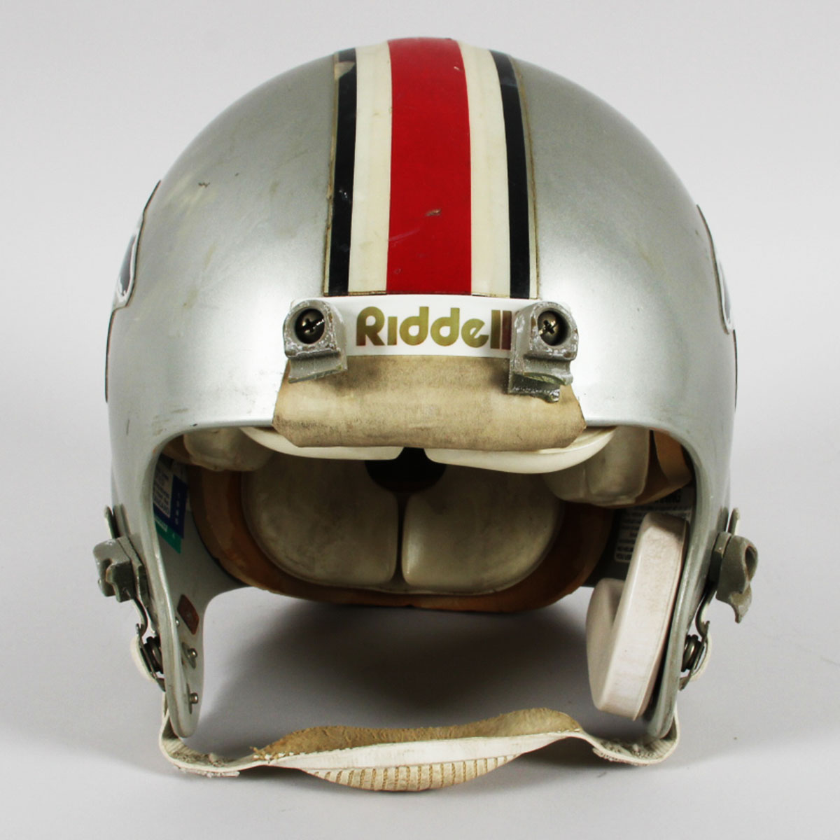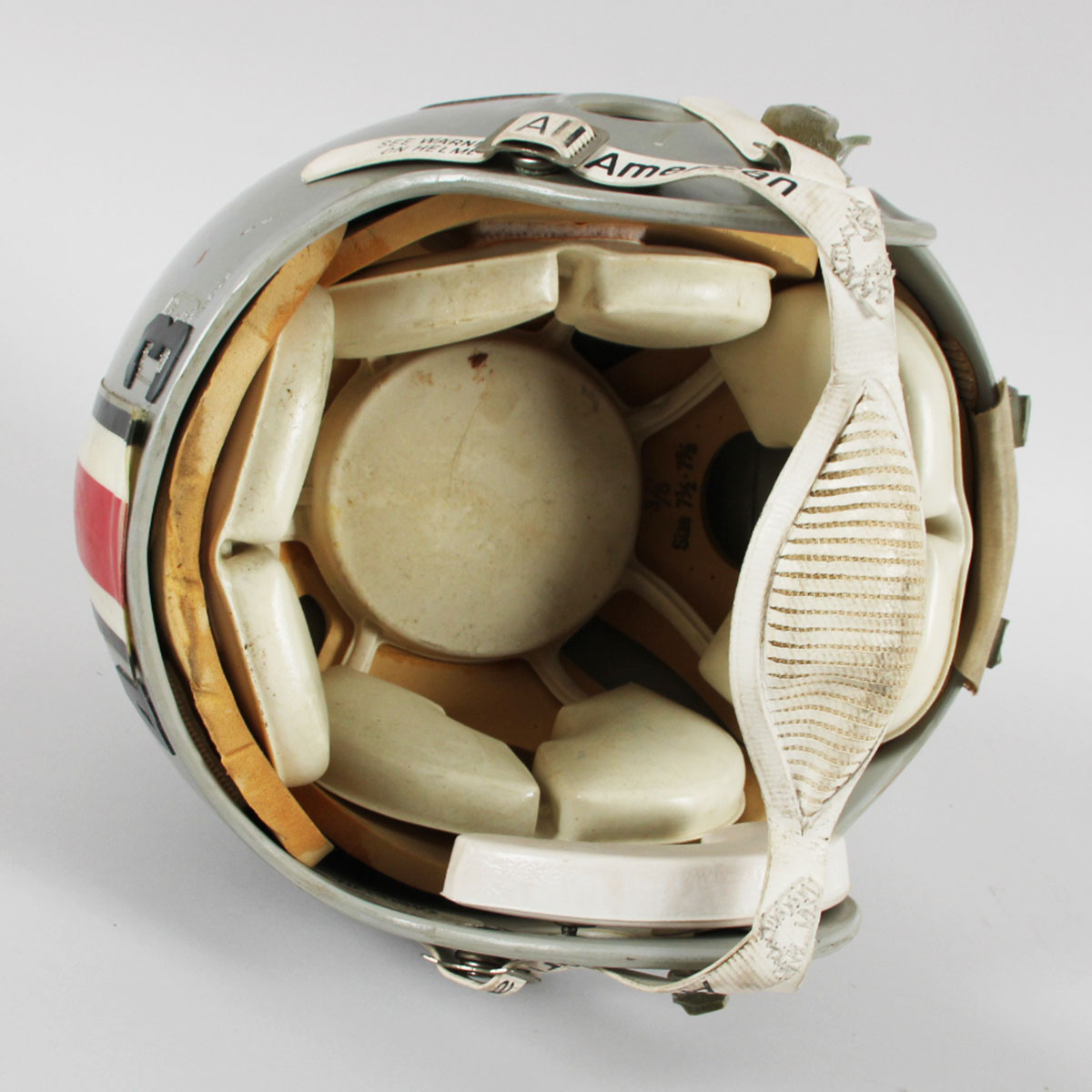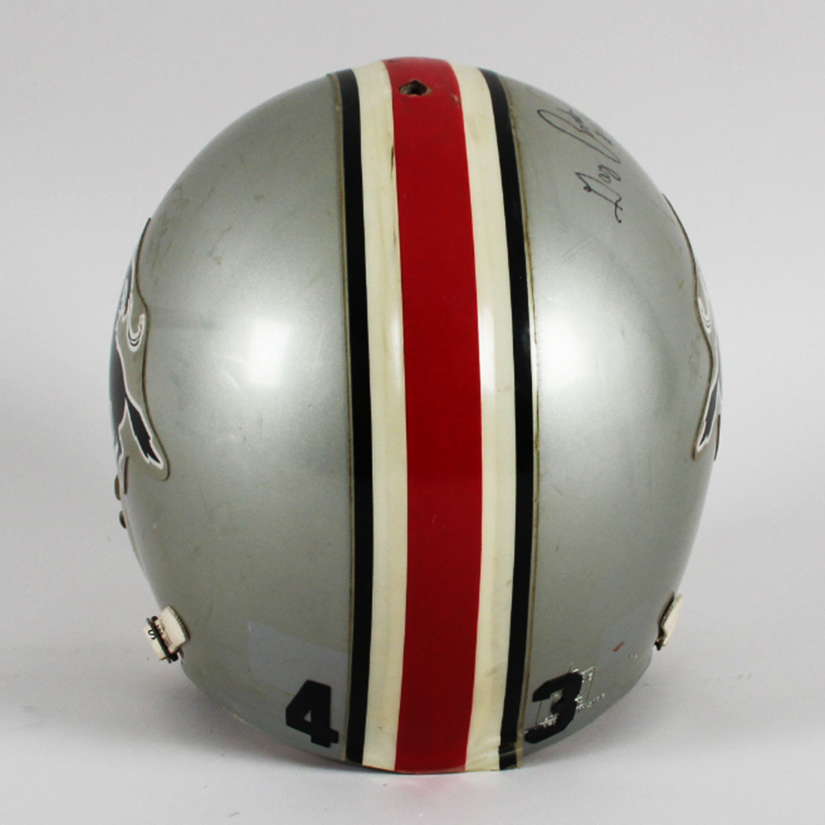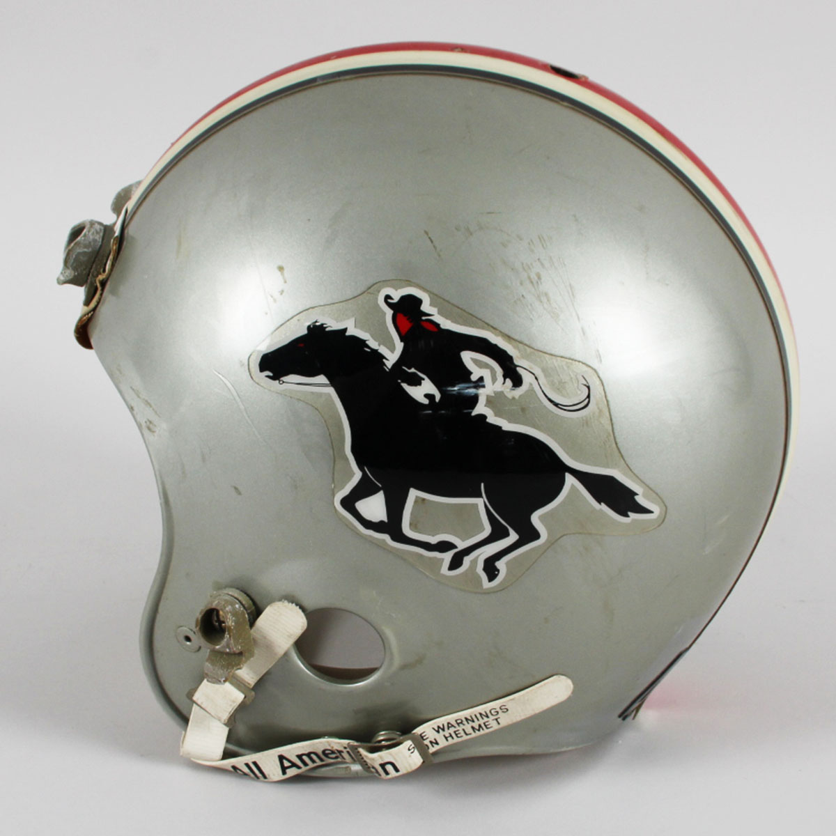 A charter member of the USFL, the Tampa Bay Bandits were the only franchise to have the same principal owner, head coach and home field during the defunct league’s three seasons. Presented here is a game worn helmet from the mid 1980’s that was donned by Gary Anderson. The Ridell helmet [size] 3/8″ – 7-1/4 – 7 -5/8 features decals on the sides showcasing a gunslinging Texan complete with a cowboy hat. It features its original padding. The back featues Anderson’s jersey number decals 4 & 3. The black facemask is detached and the central portion features white/blue/silver striping. The interior also has warning stickers inside. Overall, the rare helmet shows heavy wear from the season with dings, scrapes, sweat etc. For added value, Gary Anderson signed it in black felt tip (“9”).