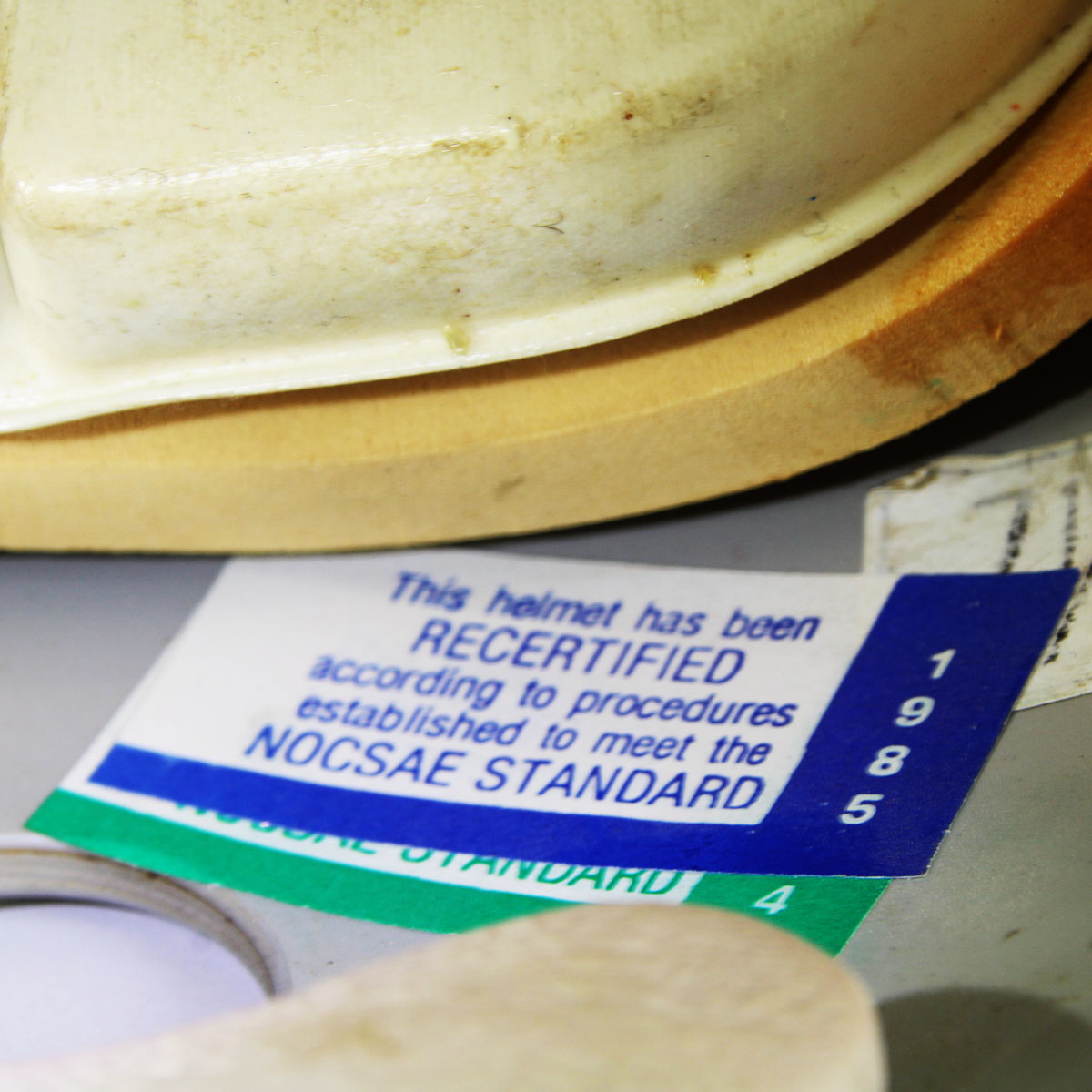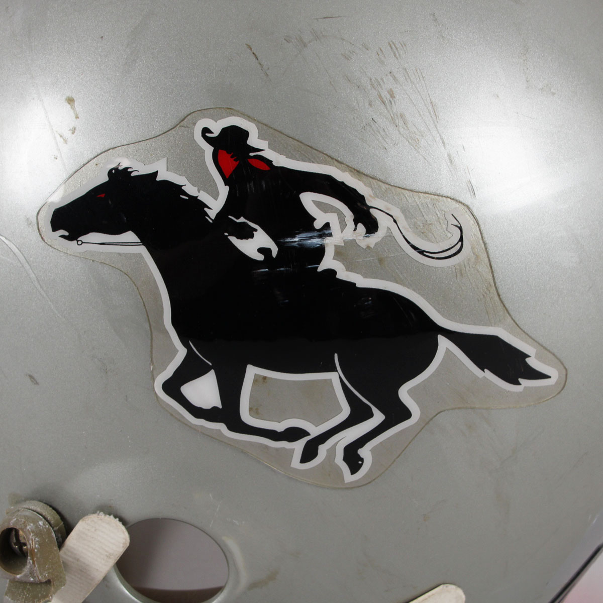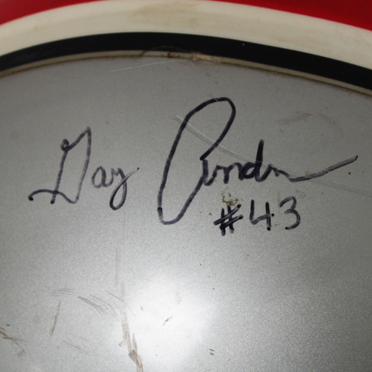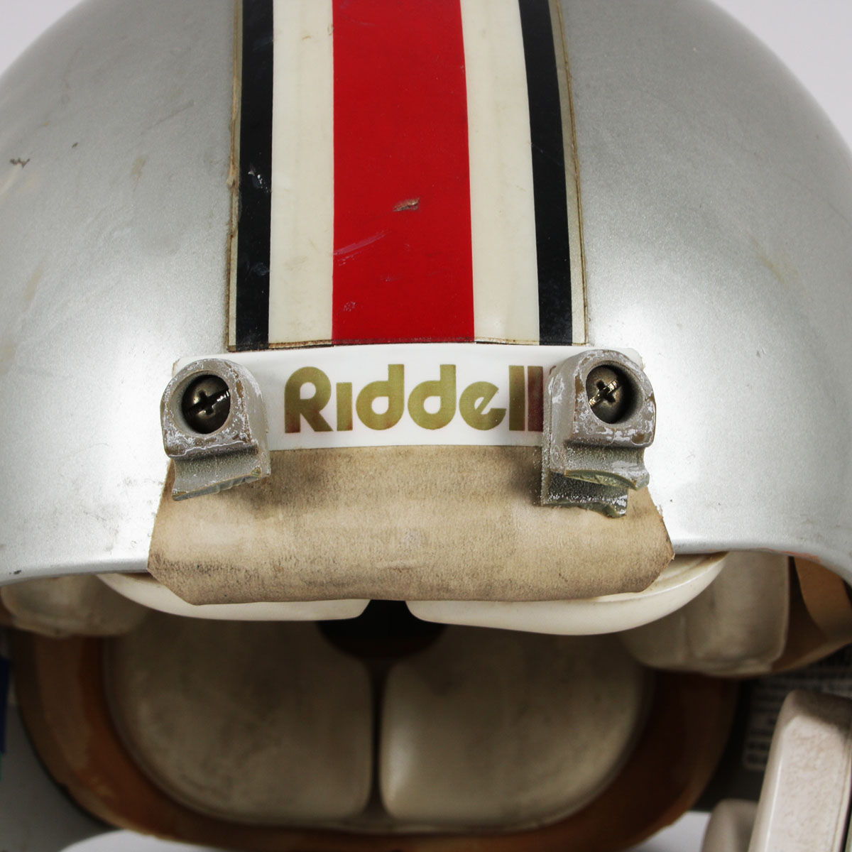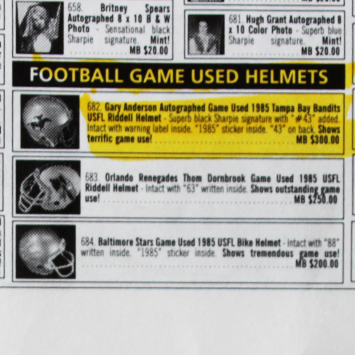 A charter member of the USFL, the Tampa Bay Bandits were the only franchise to have the same principal owner, head coach and home field during the defunct league’s three seasons. Presented here is a game worn helmet from the mid 1980’s that was donned by Gary Anderson. The Ridell helmet [size] 3/8″ – 7-1/4 – 7 -5/8 features decals on the sides showcasing a gunslinging Texan complete with a cowboy hat. It features its original padding. The back featues Anderson’s jersey number decals 4 & 3. The black facemask is detached and the central portion features white/blue/silver striping. The interior also has warning stickers inside. Overall, the rare helmet shows heavy wear from the season with dings, scrapes, sweat etc. For added value, Gary Anderson signed it in black felt tip (“9”).