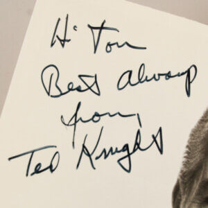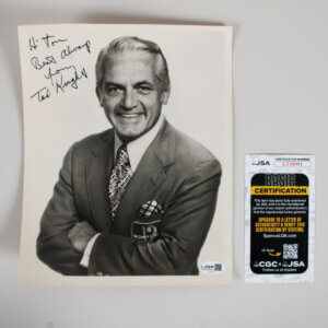 Ted Knight Signed Photo 8×10. Signature is in black felt tip and grades “10”. Personalized and inscribed. Authentication: JSA Basic Cert & Sticker