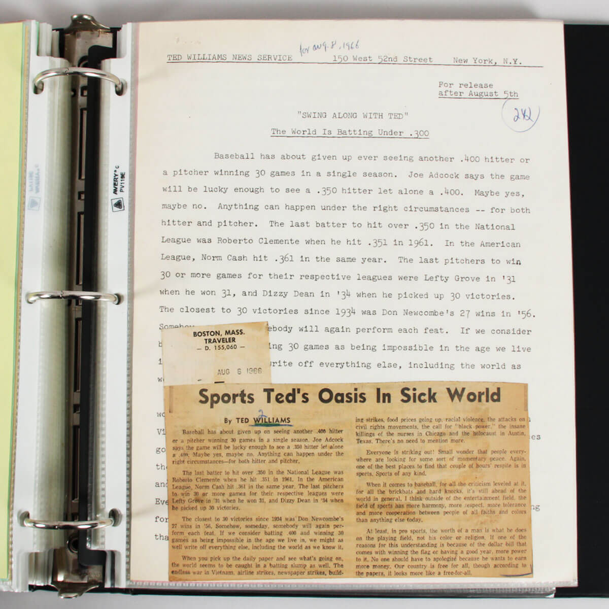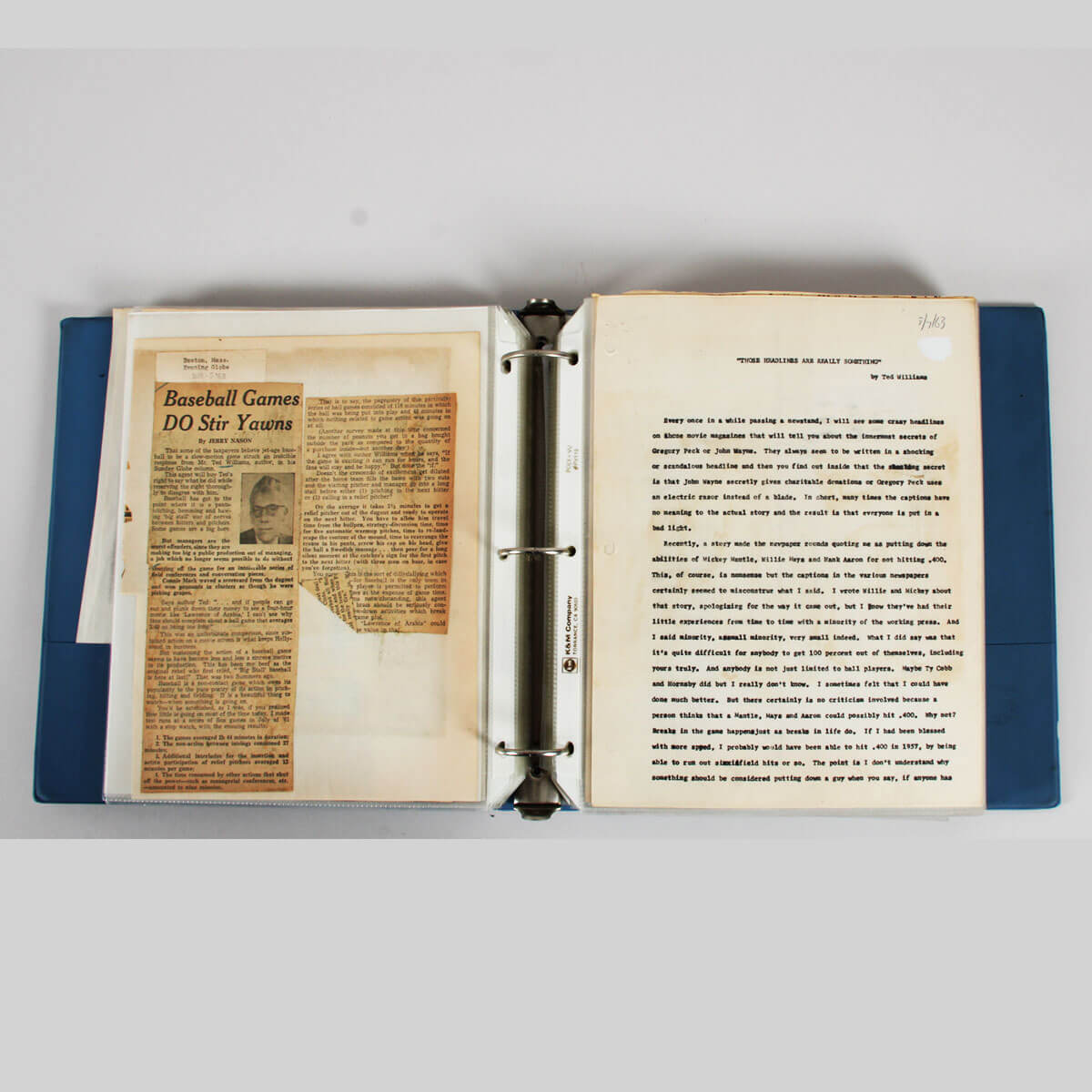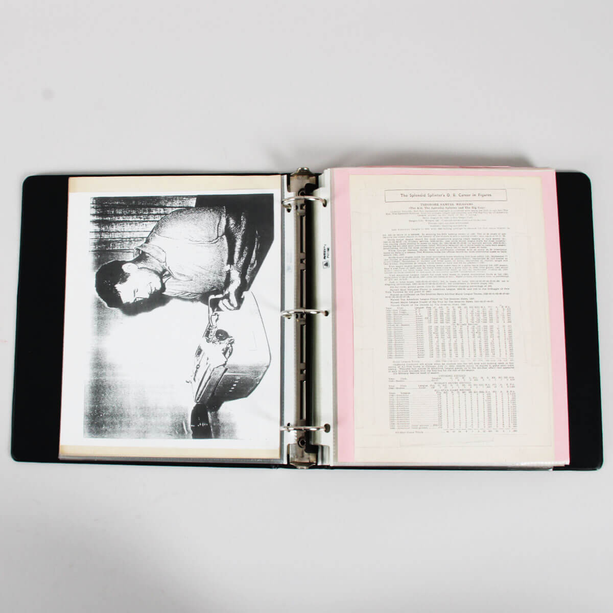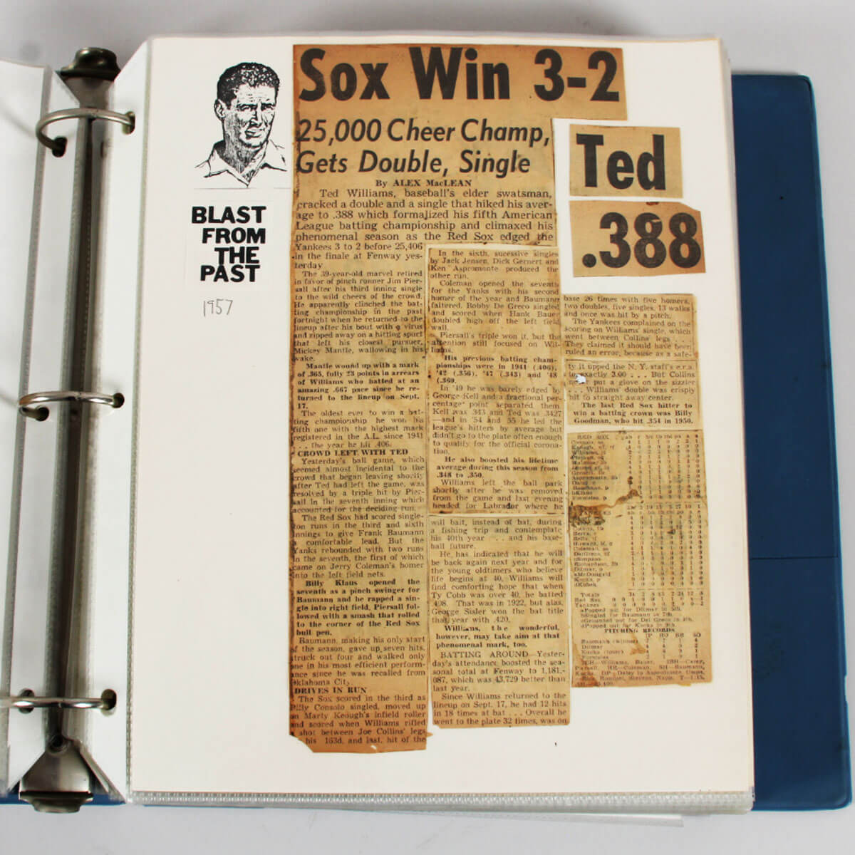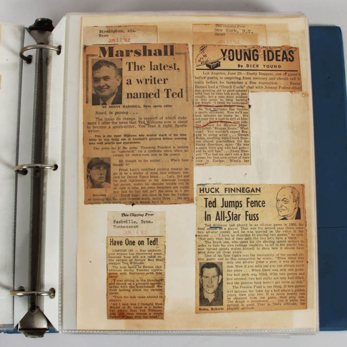Offered for sale is a Ted Williams Personal Sports Collection from the 1960s. There are two full notebooks with clippings from Ted’s playing games and newspaper clippings.